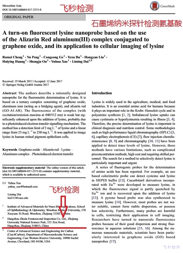 人体需要的常见氨基酸有20种,常常几个氨基酸共存在各种生命、环境、食品、医疗药品当中。因此一直很难对单一的氨基酸识别检测。飞秒检测锐意进取,发现采用石墨烯-铝-茜素红构成的纳米材料,具有飞秒级别的荧光特征,可以选择性识别水、溶剂、甚至细胞中的赖氨酸。该项研究成果对未知物检测、配方分析、配方还原和研发、工业诊断、以及疾病诊断有巨大的意义。成果已经发表在国际著名的SCI杂志Microchimica Acta上。得到采用飞秒检测的国内外研究机构的大力推荐,目前已经有国外机构询问采购该石墨烯纳米材料,用于细胞、药物、水体、植物等方面的配方检测和未知物分析。也有生产氨基酸的厂家表示将用于赖氨酸生产的在线监测,控制产品质量。