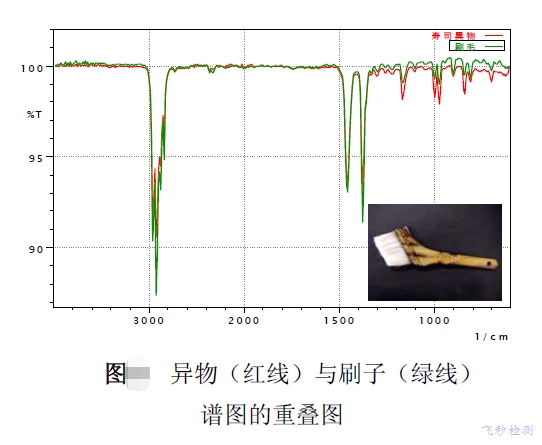 从上图可知,两谱图十分一致。所以,可以推测寿司表面的附着异物是从用于在寿司表面涂佐料汁的刷子脱落的刷毛。